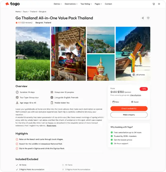 Agencies, tour operators looking to create a professional travel marketplace or directory can benefit from the Togo theme.