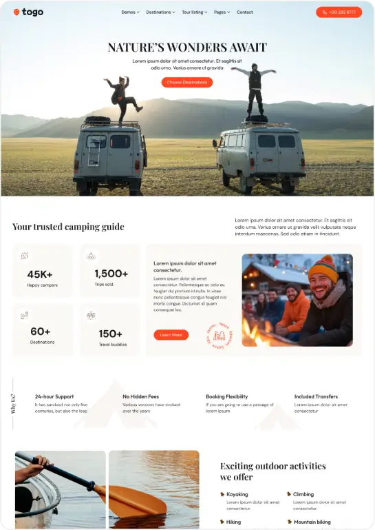 Togo is a professional WordPress theme that makes it easy to build a modern, beautiful tour booking website with full features for reservations, payments, and tour management.